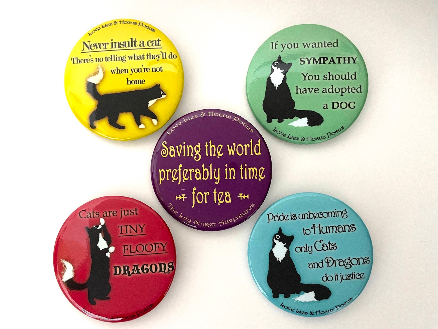 - FIVE hilarious cat snark buttons (available nowhere else)