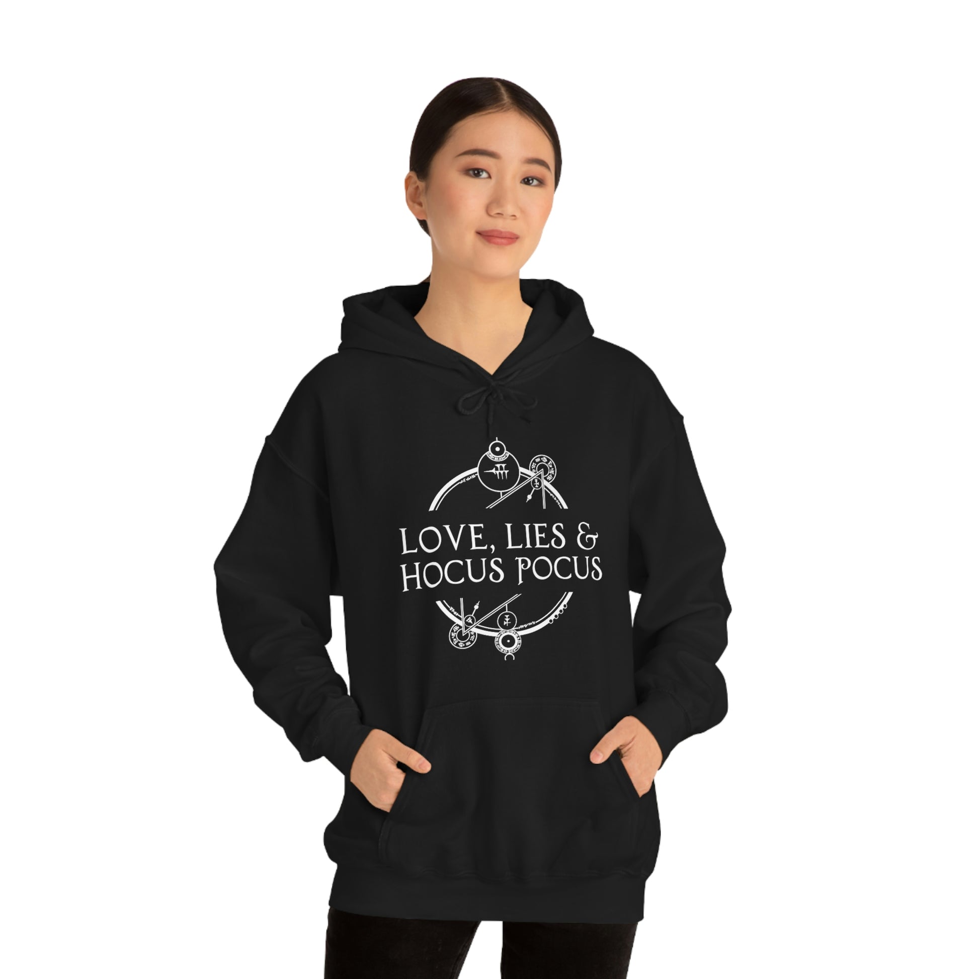 Sporting the Love, Lies, and Hocus Pocus Logo, this is a perfect hoodie for any fan of the Love, Lies, and Hocus Pocus Universe. It is crafted for comfort and as a lighter weight sweatshirt it is perfect for relaxing in. Once you put it on, you won't want to take off.