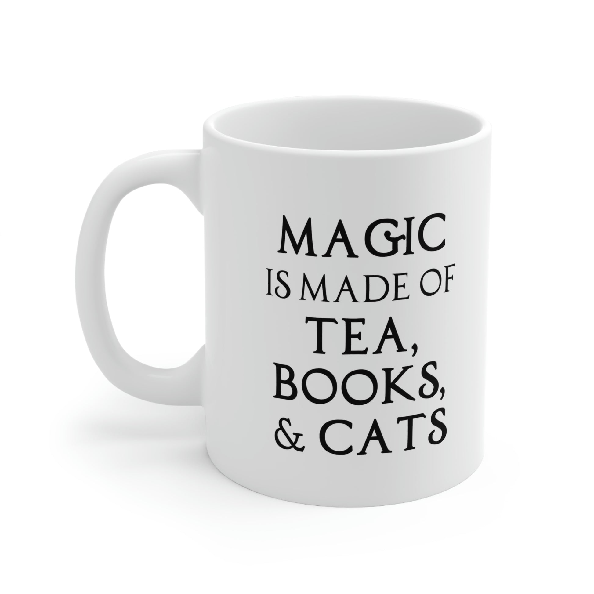 Warm your soul with a nice cuppa out of this perfectly sized magical Sir Kipling ceramic mug. It’s microwave and dishwasher safe, made of white, durable ceramic in an 11-ounce size. It's high-quality sublimation printing makes it the perfect gift for your true coffee, tea, or hot chocolate-lover. The caption on it reads "Magic is made of Tea, Books, & Cats."