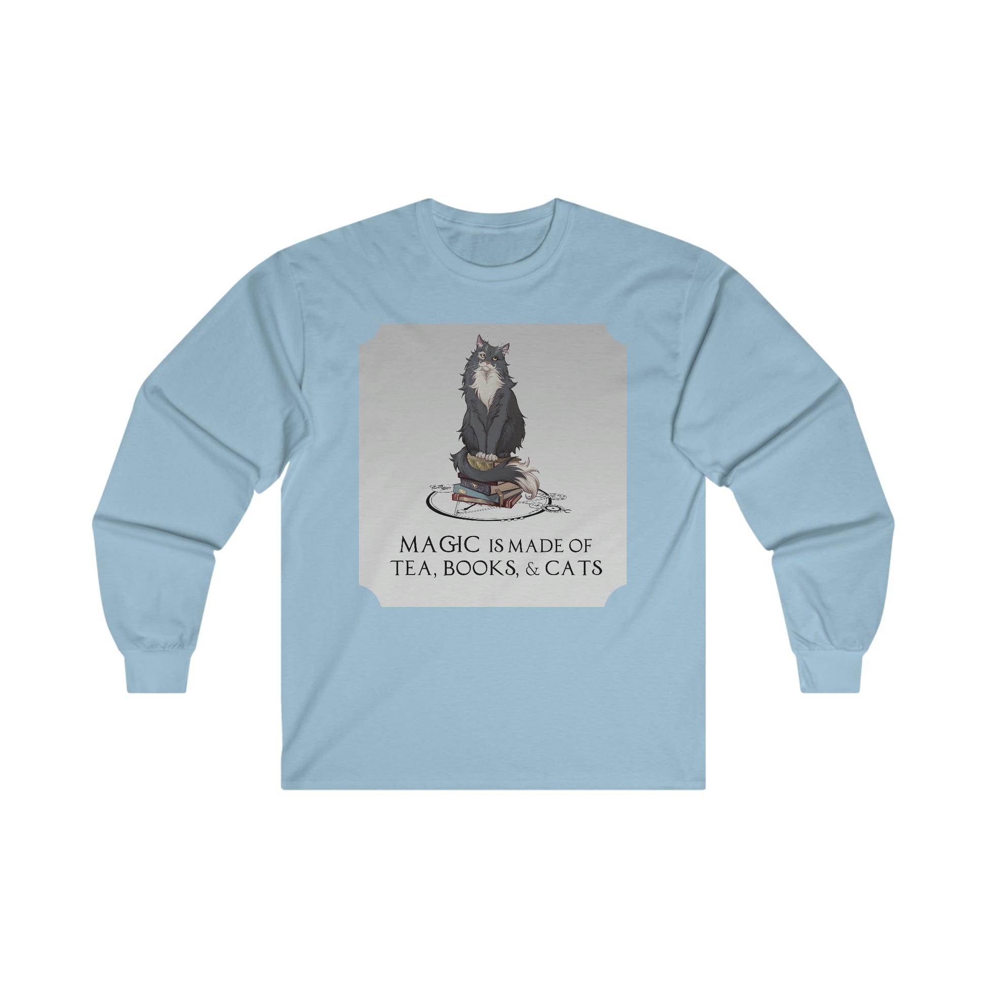 Any fan of magic, snark, or the Love, Lies, and Hocus Pocus Universe will love this stylish long sleeve tee sporting Sir Kipling at his finest. The quote on it reads "Magic is made of tea, books, and cats." The quality cotton construction makes the design shine, and all materials are sustainably sourced and economically friendly. The shoulders are tapped for a good upper-body fit, and there are no side seams, ensuring a clean, unbroken flow.